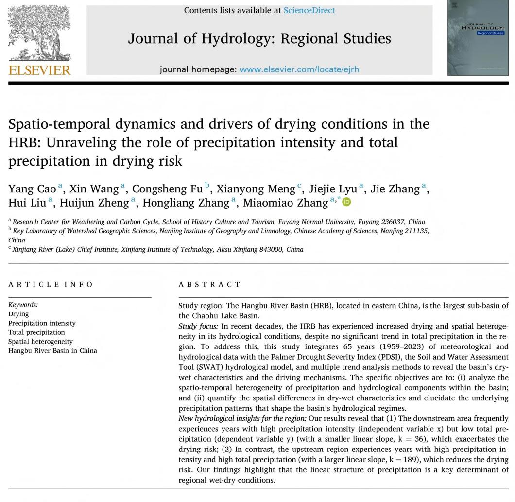 近日,学院流域风化与碳循环研究团队青年教师、地理信息科学专业教师曹阳博士在国际水文学领域知名期刊《Journal of Hydrology: Regional Studies》(中科院二区TOP期刊,影响因子4.7)发表研究论文,题为“Spatio-temporal dynamics and drivers of drying conditions in the HRB: Unraveling the role of precipitation intensity and total precipitation in drying risk”。阜阳师范大学为论文第一完成单位,曹阳博士为论文第一作者,学院人文地理与城乡规划专业教师张苗苗博士为通讯作者,其在地表环境数据构建及论文修改过程中提供了关键支持。论文合作者还包括中国科学院南京地理与湖泊研究所付丛生研究员、新疆理工学院孟现勇教授、流域风化与碳循环研究团队教师吕杰杰、张结、刘慧、郑辉军、章宏亮,以及本科生王欣同学。
