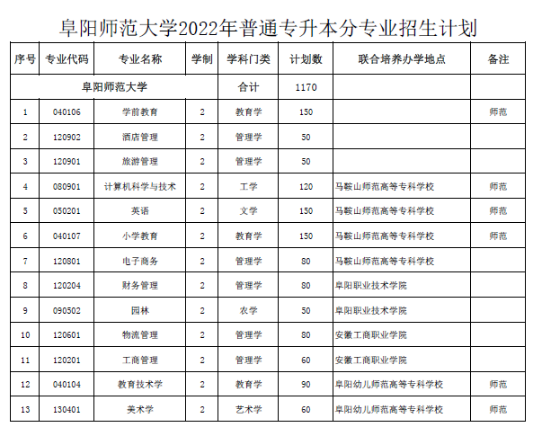 阜阳师范大学2022普通专升本分专业招生计划