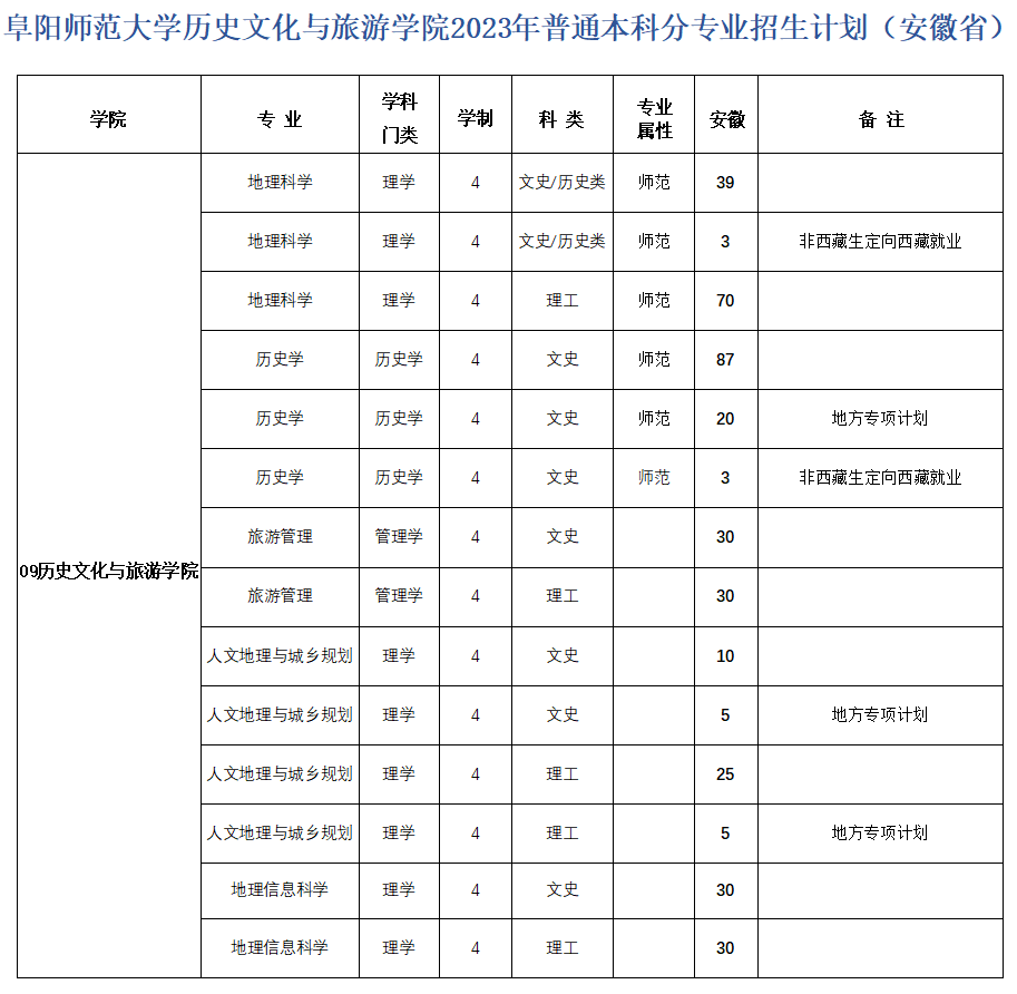 阜阳师范大学历史文化与旅游学院创办于1987年,现有历史系、地理系、旅游系等3个系和省级一流专业历史学、地理科学、人文地理与城乡规划、地理信息科学、旅游管理、酒店管理等6个专业,均为安徽省一批次招生;拥有学科教育(历史教学)专业硕士学位授权点和城乡规划学学术硕士学位授权点。