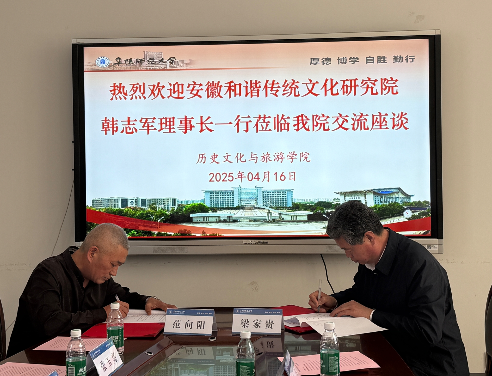 4月16日,安徽和谐传统文化研究院理事长韩志军、京众(安徽)客运服务有限公司总经理范向阳、阜阳市原档案局副局长胡天生一行8人莅临学院,就深化校企合作进行座谈交流。学院院长梁家贵、副院长郭从杰、党委副书记卞会泉、历史系主任胡乐伟等参加会谈。
