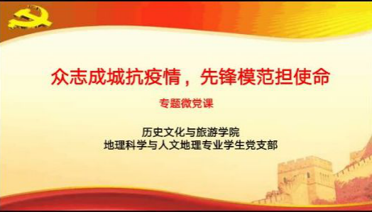 为深入学习贯彻习近平总书记对新型冠状病毒感染的肺炎疫情的重要指示精神和学校文件要求,确保疫情防控期间党的组织生活质量,3月11日,历史文化与旅游学院地理科学与人文地理专业学生党支部以视频会议的方式,开展了“众志成城抗疫情,先锋模范担使命”主题微党课活动。支部全体党员参加了此次活动,活动由支部书记于雪梅老师主持。