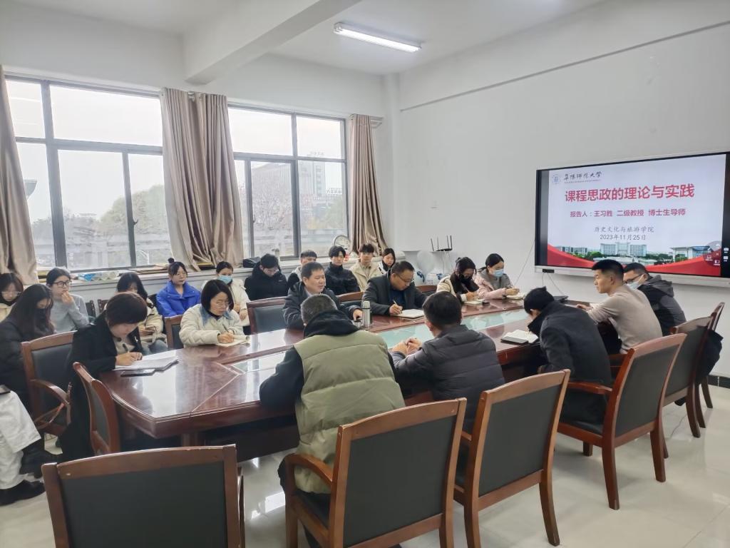 为落实立德树人根本任务,推动思政课程与课程思政同向同行、协同育人,11月25日下午,学院举办课程思政专题报告会。安徽师范大学教学名师、教育部高校思想政治理论课教指委委员、二级教授、博士生导师王习胜应邀作题为“课程思政的理论与实践”的辅导报告。学院党委书记吴磊主持报告会,青年教师及2022级、2023级学科教学(历史)研究生40余人聆听报告会。