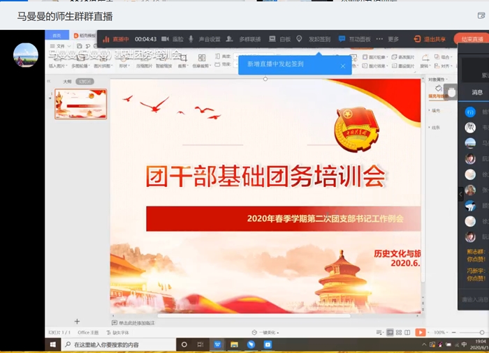 为加强院团干部队伍建设,提高团干部工作能力,帮助各团支部更好地开展工作,历史文化与旅游学院团委于6月14日晚7点利用钉钉群直播召开团干部基础团务培训会暨本学期第二次团支部书记工作例会。此次培训由团委负责人马曼曼老师主讲,全院各班团干部参加。