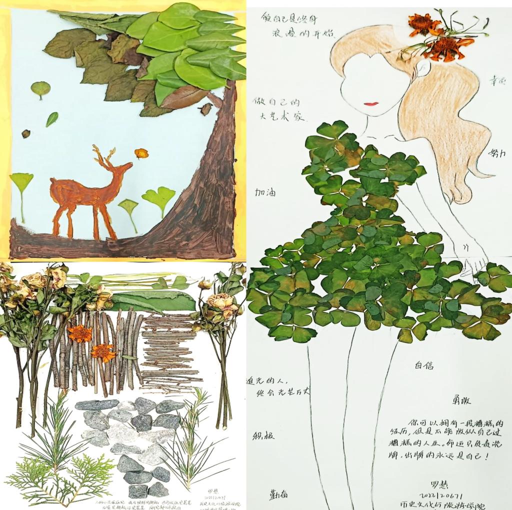 本次活动以园艺疗愈为主题,旨在促进学生身心健康发展。活动中,同学们自由组队制作植物拼贴画,充分发挥灵感和创意,用斑斓的树叶、绚丽的花瓣、多彩的颜料拼凑出一幅幅精美的艺术作品,或是雄伟壮观的中国地图,或是惟妙惟肖的动物乐园,或是春意盎然的田园风光,他们用手工技艺将美丽展示。活动结束后,同学们纷纷表示,“在活动中得到了放松和成长,心情变得更愉悦了。”