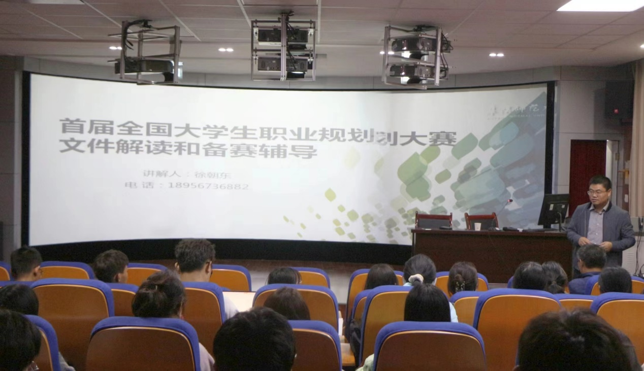 徐朝东围绕《教育部关于举办首届全国大学生职业规划大赛的通知》的要求,以“首届全国大学生职业规划大赛文件解读和备赛辅导”为题,从“比赛的重要性、比赛内容和比赛要点”等三个方面,对此次大赛的规则和要求进行了详细解读,对备赛、参赛的注意事项进行了细致指导。他指出,本次大赛较过往具有更全覆盖、更强引领、更高水平的特点,有利于大学生成功就业、高质量就业,并列举我校学生过往参赛经历,鼓励同学们积极参赛。他强调,广大同学要根据自己的专业特长和知识结构,结合当下社会环境与国家政策,从实际出发选择职业和工作岗位,避免不切实际造成“慢就业”。会后,同学们就本次大赛积极踊跃提出疑问,徐朝东一一进行回答。