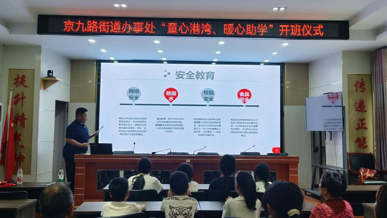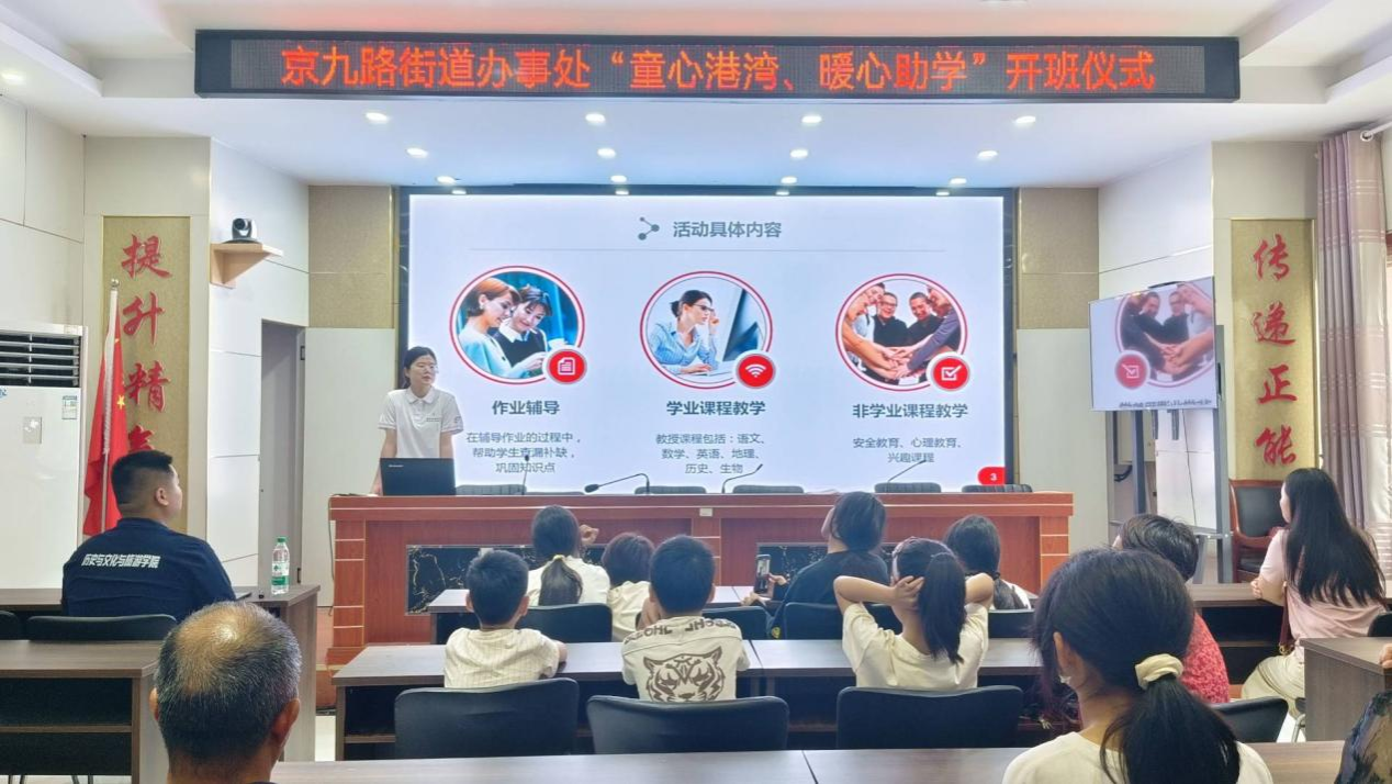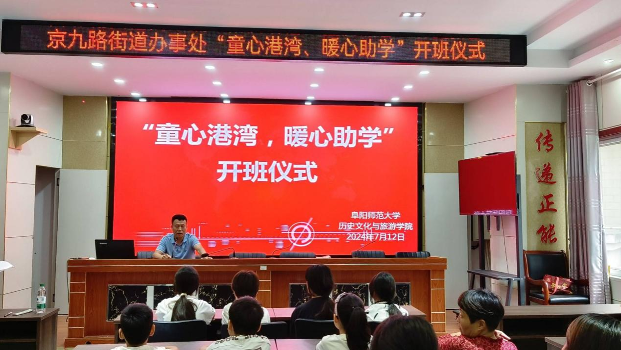 为积极响应党的二十大号召,深化高校学子服务基层的理念,有效推进“三支一扶”政策的实践落地,阜阳师范大学历史文化与旅游学院永葆童心队7月12日在京九路街道办事处黄庄社区党群服务中心举行暑期“三下乡”支教活动开班仪式。办事处文明办专员孙健、带队老师杨梦雨出席开班仪式,仪式由队长李建军主持。