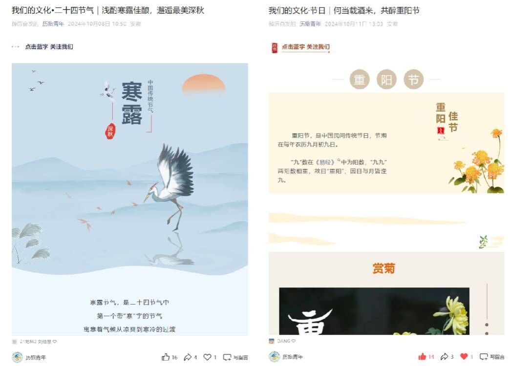 节日节气线上展,传统根脉焕新颜。为积极营造欢乐祥和的节日氛围,2024年度,学院紧扣“文化自信”的时代主题,聚焦传统节日和二十四节气,依托“历旅青年”微信公众号推出了“我们的文化·传统节日”“我们的文化·二十四节气”等专题栏目,用生动的文字和精美的图片充分展示传统节日和节气的历史由来、传说故事及其丰富多彩的庆祝习俗,帮助同学们更好地了解中华优秀传统文化的深厚底蕴与无穷魅力,在探索与传承中书写属于自己的华彩篇章。