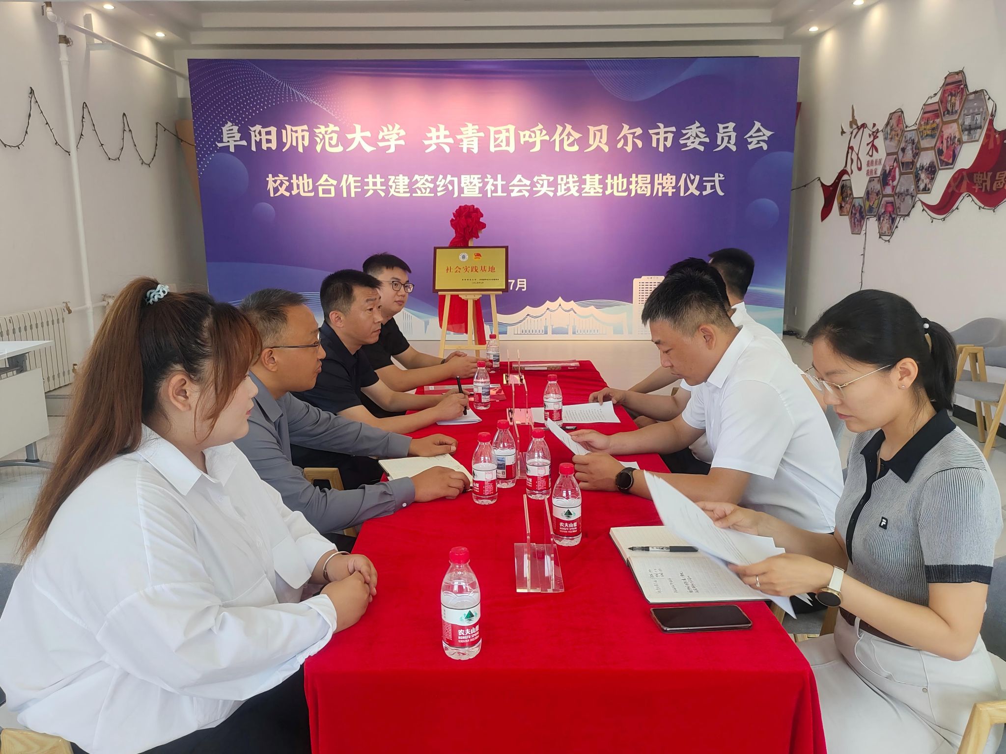 共建实践基地,共绘育人蓝图。座谈会上,共青团呼伦贝尔市委员会书记朝勒蒙对慰问组一行表示欢迎,介绍了团市委基本情况,表示将全力保障阜阳师范大学实践团队在蒙活动开展,共同培育服务边疆建设的青年力量。校团委副书记(主持工作)戴亮在发言中表示,将以此次合作为契机,依托“校—市—区”三级联动机制,将呼伦贝尔作为学校深化实践育人的重要阵地,重点打造民族团结支教、乡村振兴服务、青年创新创业等实践平台。会上,双方正式签署《大学生社会实践基地共建协议》,并为基地揭牌。