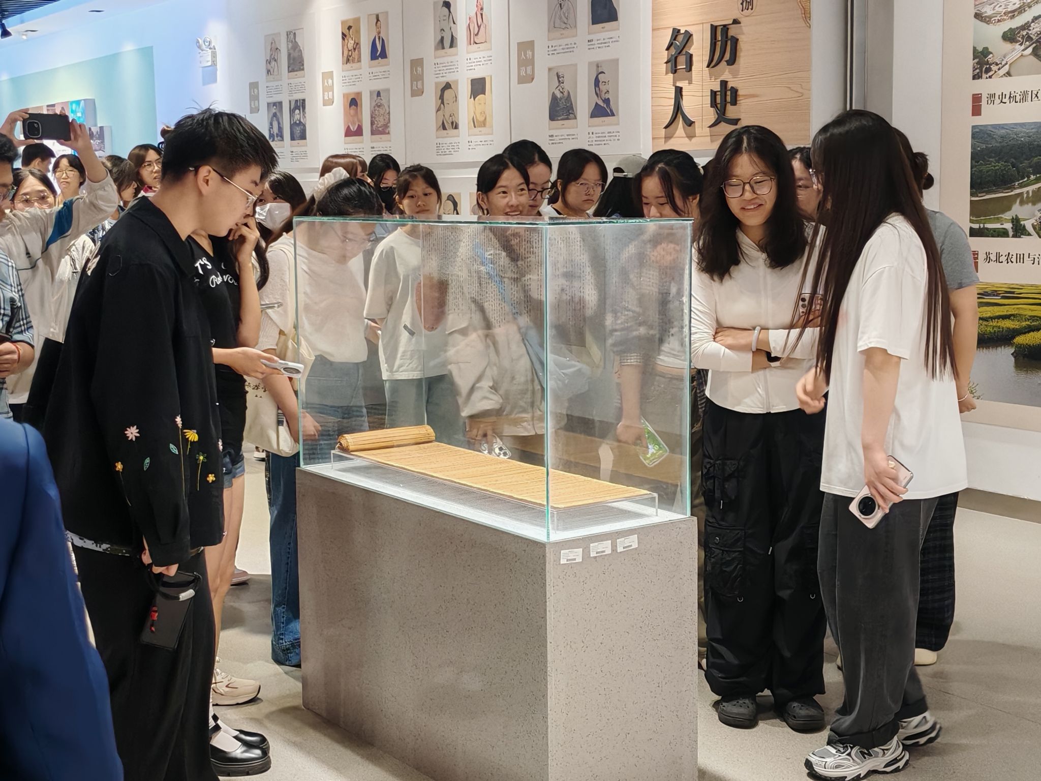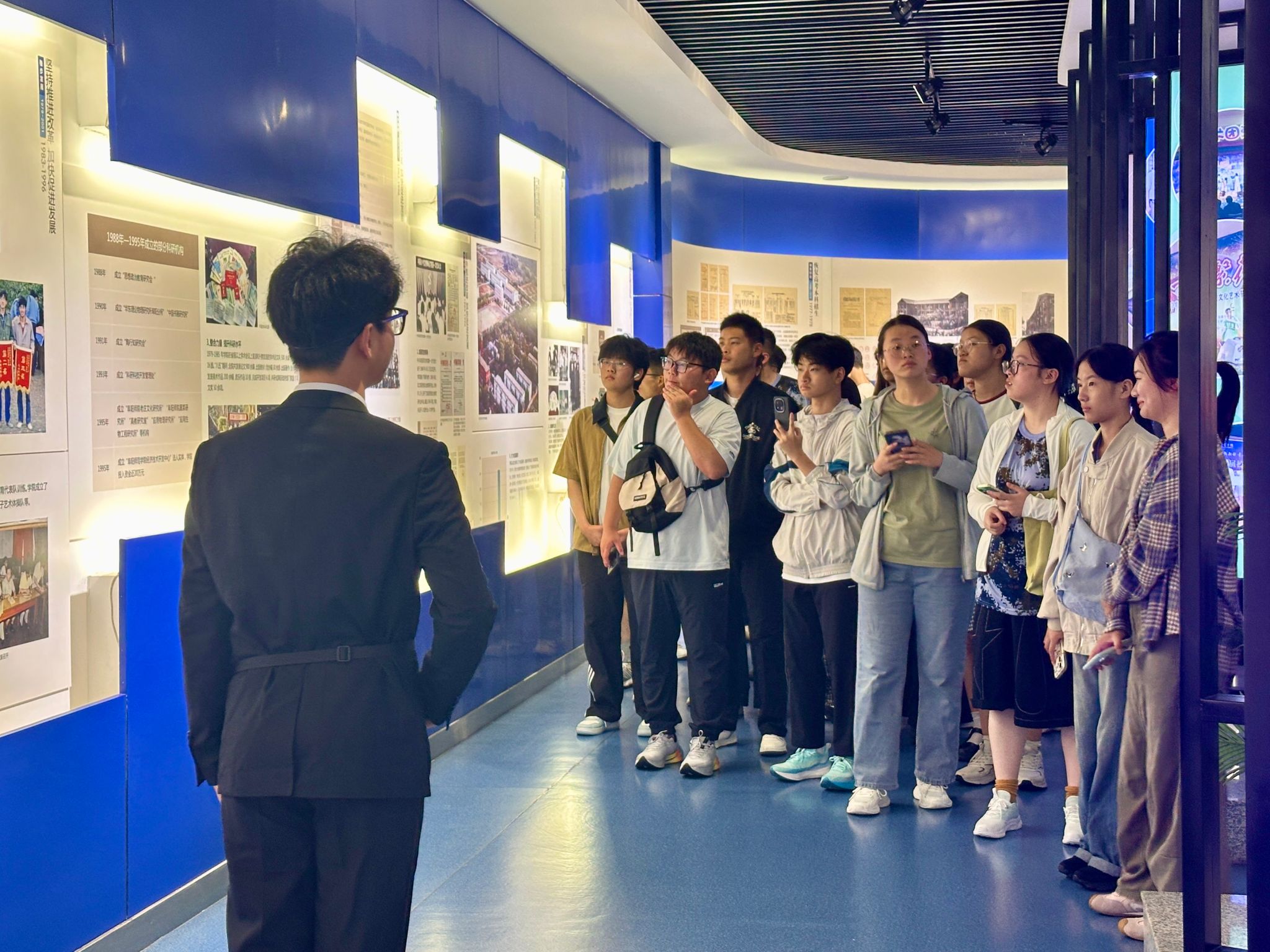 在校史馆讲解员的引导下,同学们依次参观了“序厅”“领导关怀”“发展历程”“校友风采”“淮河文化”等多个主题展区。通过一幅幅珍贵的历史图片、一件件厚重的实物档案、一段段生动的影像资料,新生们逐步了解了阜阳师范大学自建校以来的发展脉络、办学成就与文化传统。从艰苦创业的早期岁月,到改革开放后的快速发展,再到新时代的战略布局,同学们深刻感受到学校深厚的历史底蕴和不断进取的精神风貌。参观过程中,新生们不时驻足观看、拍照记录,专注聆听讲解,沉浸在学校厚重的历史文化氛围中。