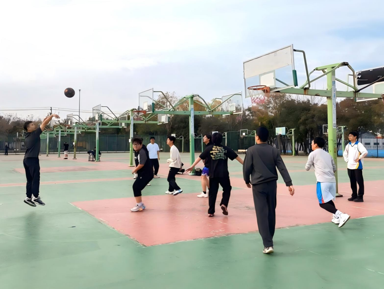 比赛伊始,师生双方迅速进入状态。教工队凭借丰富经验与默契配合,组织有序、防守稳健;新生联队则活力充沛、攻势迅猛,屡次上演快速突破与精准远投。场上节奏紧张、对抗激烈,充分展现出师生团结拼搏、勇于争先的体育精神,场边观众的掌声与喝彩声此起彼伏。