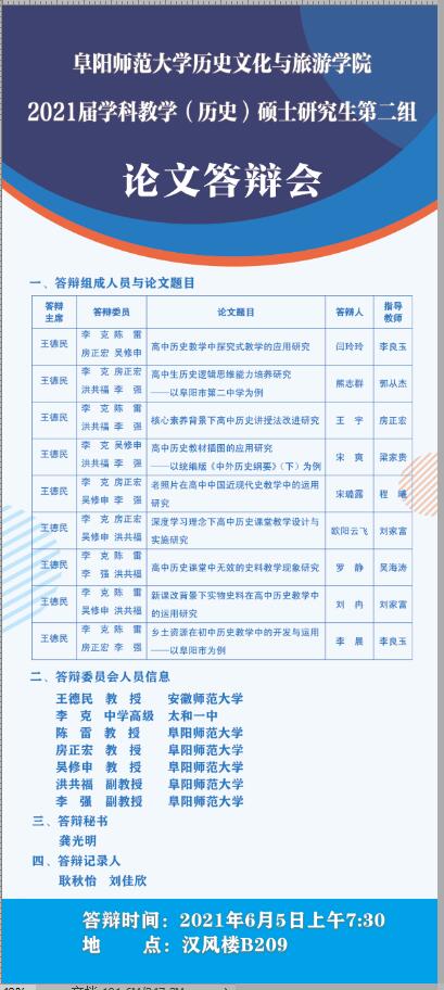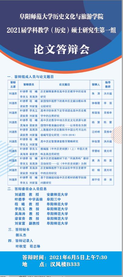 阜阳师范大学历史文化与旅游学院2021届学科教学(历史)硕士研究生答辩通告