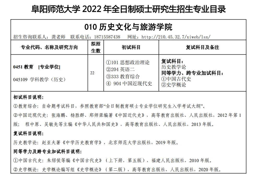 阜阳师范大学历史文化与旅游学院2022年学科教学(历史)硕士研究生招生专业目录