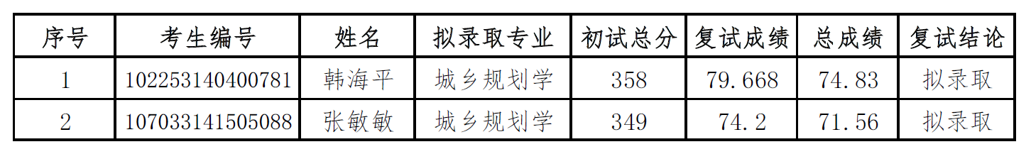 根据教育部《关于印发<2023年全国硕士研究生招生工作管理规定>的通知》(教学〔2022〕3号)、《关于做好2023年全国硕士研究生复试录取工作的通知》(教学司〔2023〕3号)和安徽省高等学校招生委员会 安徽省教育厅《关于做好安徽省2023年硕士研究生复试录取工作的通知》(皖招委〔2023〕4号)等文件精神,按照安徽省2023年硕士研究生招生录取工作会议要求、阜阳师范大学历史文化与旅游学院2023年硕士研究生复试录取工作方案。现将我院2023年城乡规划学专业第二次调剂复试全日制硕士研究生拟录取名单公示如下: