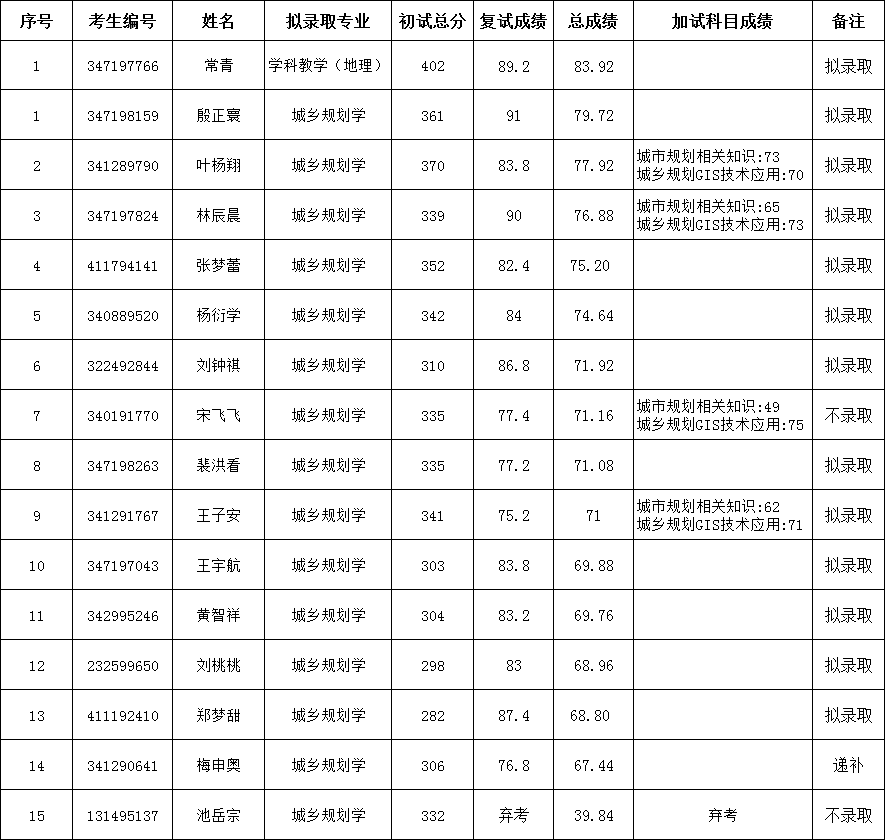 根据教育部《关于印发<2024年全国硕士研究生招生工作管理规定>的通知》(教学〔2023〕2号)、《关于做好2024年全国硕士研究生复试录取工作的通知》(教学司〔2024〕1号)和安徽省高等学校招生委员会安徽省教育厅《关于做好安徽省2024年硕士研究生复试录取工作的通知》(皖招委〔2024〕15号)等文件精神,按照安徽省2024年硕士研究生招生录取工作会议要求、阜阳师范大学历史文化与旅游学院2024年硕士研究生复试录取工作方案。现将我院2024年学科教学(地理)、城乡规划学专业第一志愿全日制硕士研究生拟录取名单公示如下: