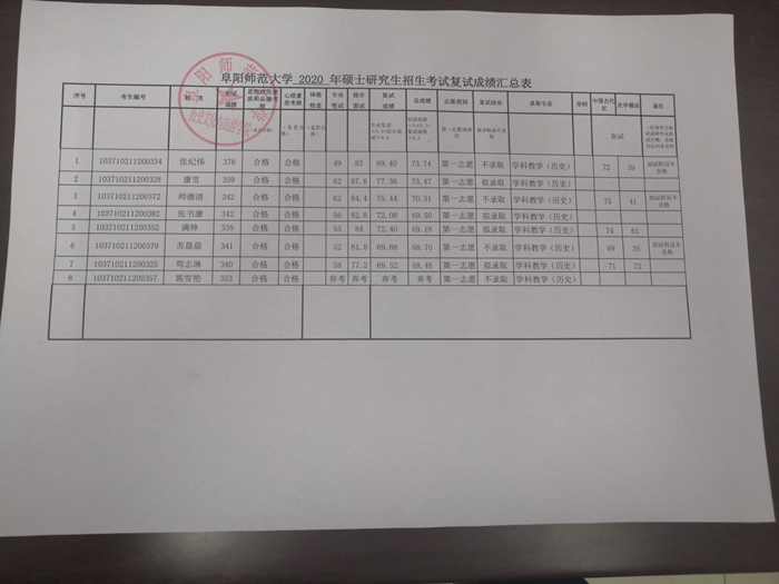阜阳师范大学2020年学科教学(历史)硕士研究生招生考试复试成绩汇总表公示