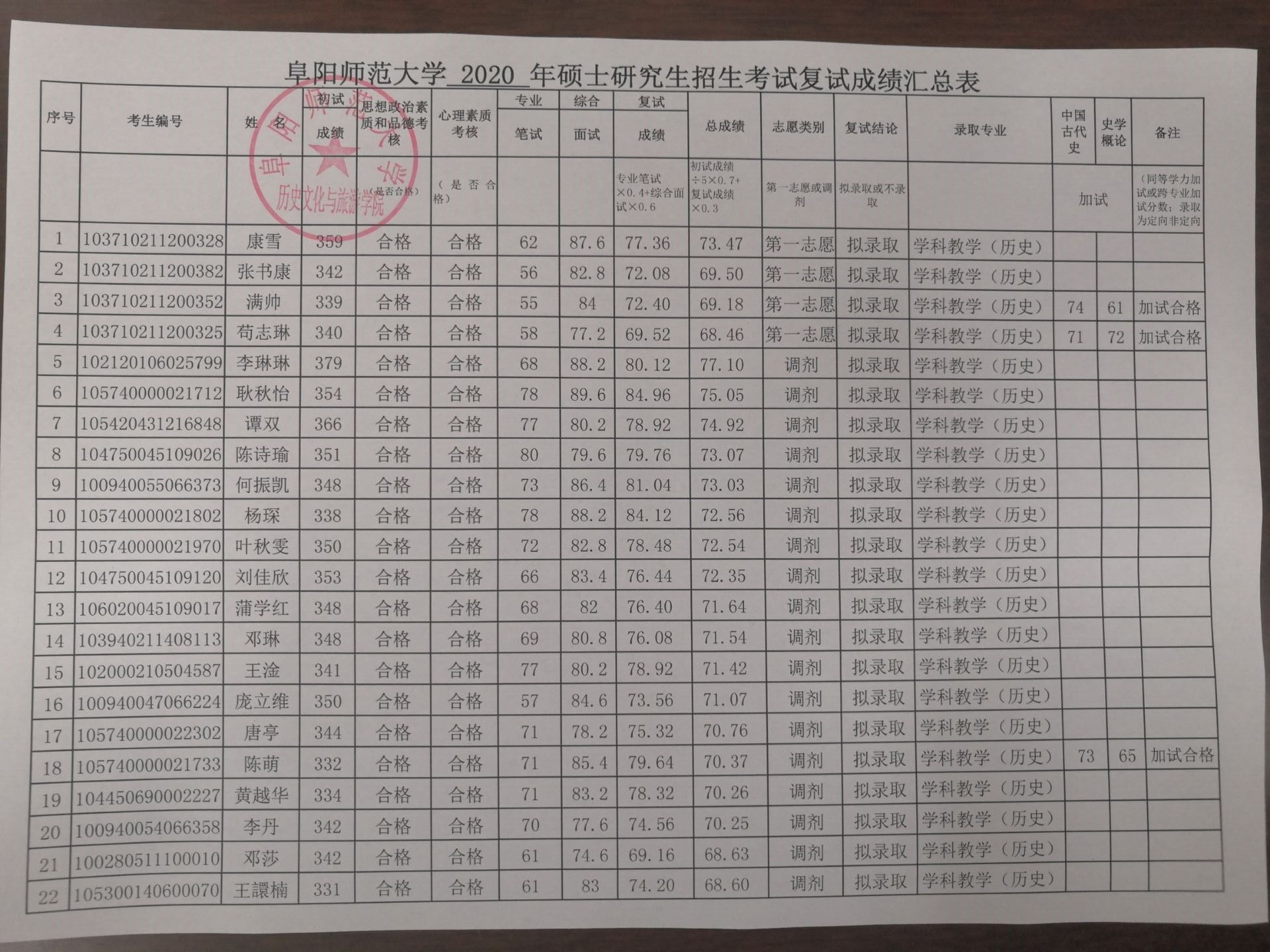 阜阳师范大学历史文化与旅游学院2020年研究生招生考试复试成绩汇总表