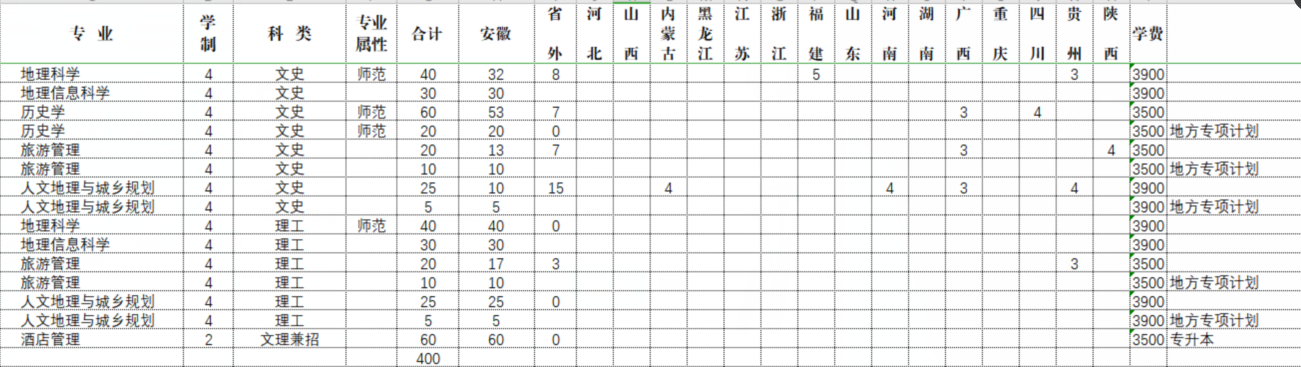 历史文化与旅游学院2020年秋季拟招生400人。历史学专业招生80人,其中地方专项计划招生20人,安徽省内招生73人,省外招生7人;地理科学专业招生80人,文史、理工类各招生40人,其中文史类安徽省内招生32人,省外招生8人;人文地理与城乡规划专业招生60人,文史、理工类各招生30人,其中地方专项计划文、理各招生5人,文史类安徽省省内招生15人,省外招生15人;旅游管理专业招生60人,文史、理工类各招生30人,其中地方专项计划文、理各招生10人,文史类安徽省内招生23人,省外招生7人,理工类安徽省内招生27人,省外招生3人;地理信息科学专业招生60人,文史、理工类安徽省内各招生30人;酒店管理专业招生60人,安徽省内专升本文理兼招。