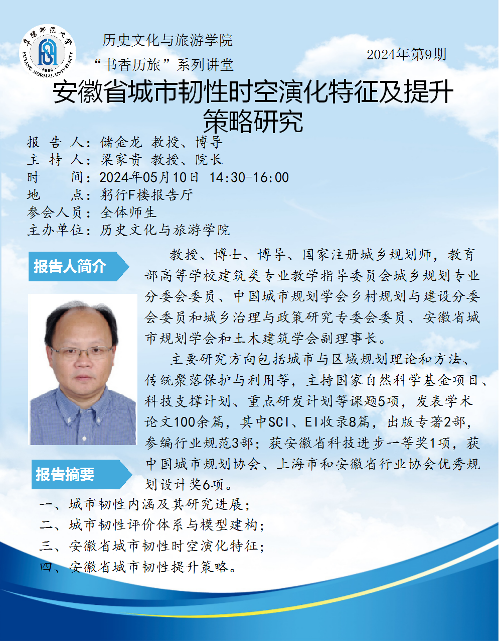“书香历旅”系列讲堂2024年第9期:安徽省城市韧性时空演化特征及提升策略研究