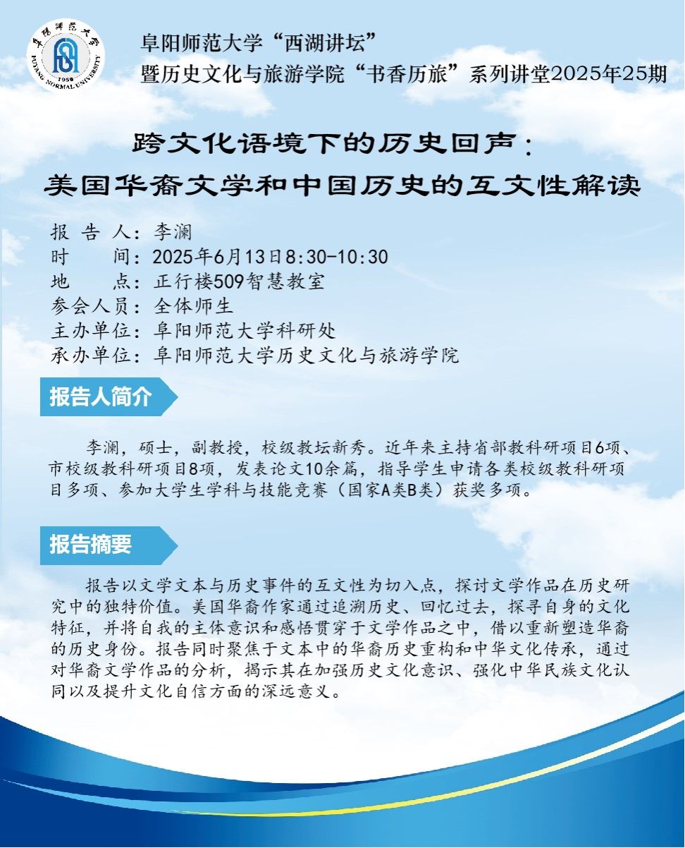 “书香历旅”系列讲堂2025年第25期:跨文化语境下的历史回声:美国华裔文学和中国历史的互文性解读