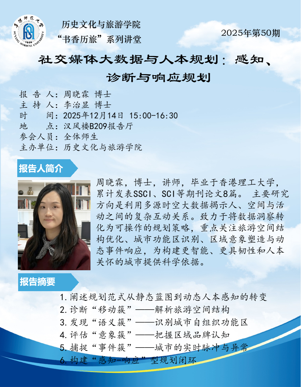 “书香历旅”系列讲堂2025年第50期:社交媒体大数据与人本规划:感知、诊断与响应规划