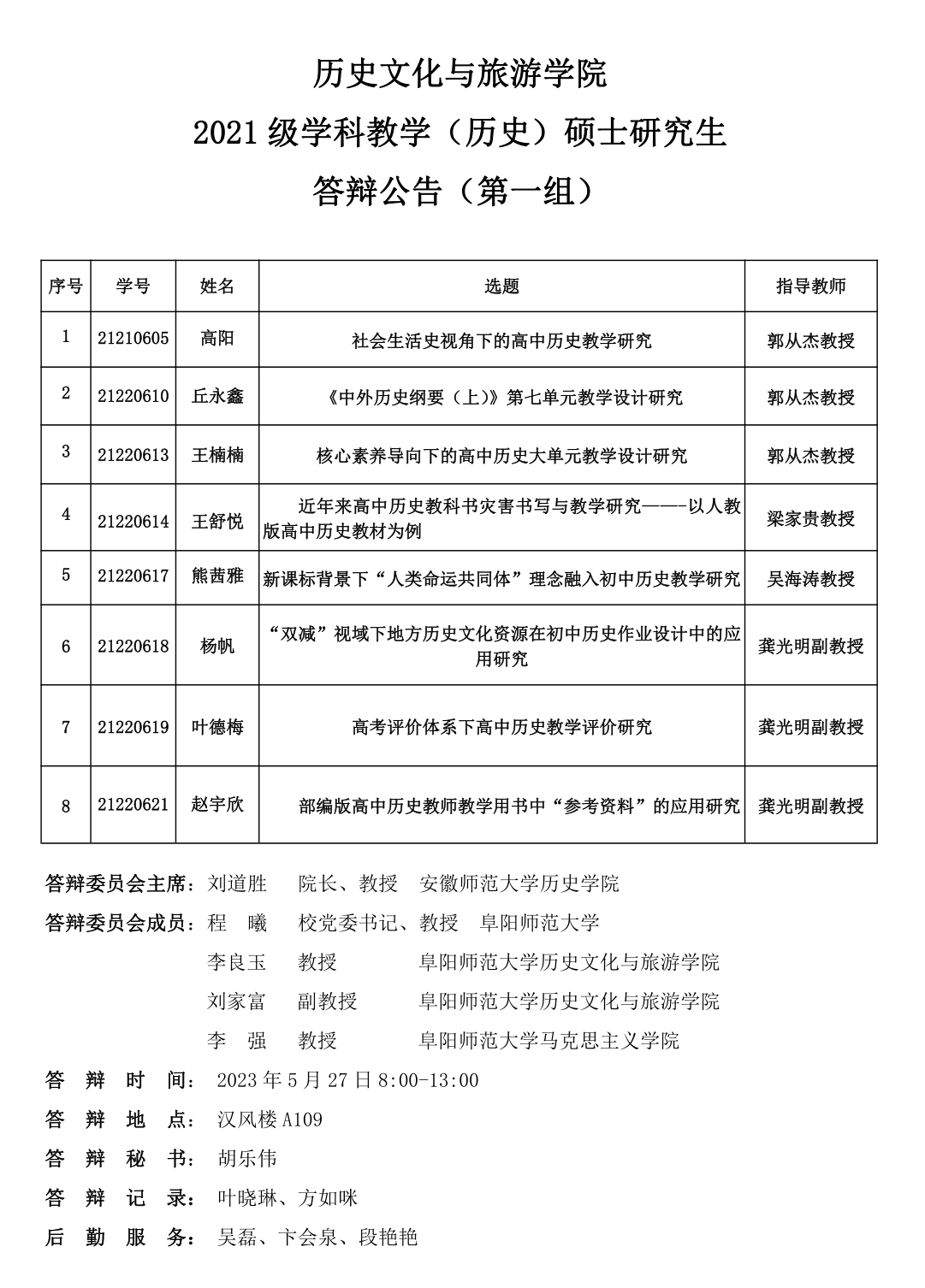 历史文化与旅游学院2021级学科教学(历史)硕士研究生答辩公告(第一组)