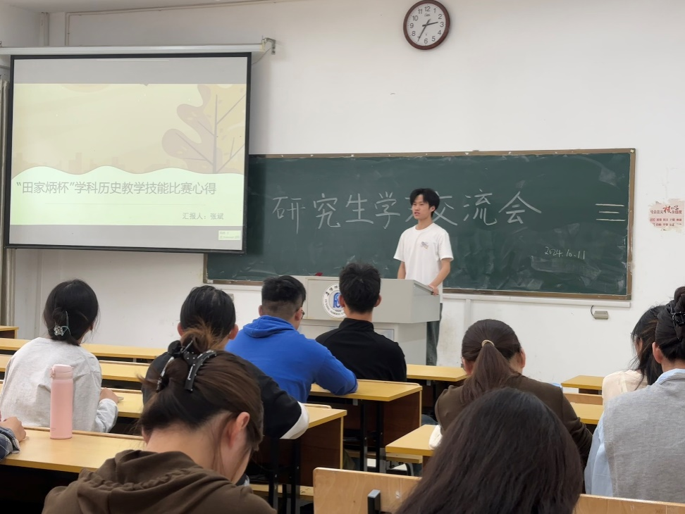 张斌分享了备战“田家炳杯”全日制教育硕士专业学位研究生教学技能大赛的历程与体会。他认为熟练掌握“三字一话”和教学内容是一名新手教师上好课的基本功,学科教学专业研究生应多注重研读教研论文、构建教学思路、形成“教学评”一体化课堂。同时,张斌强调教学不能只注重知识点,更应该培养学生的家国情怀,设计有情感有深度有内涵的教学内容。