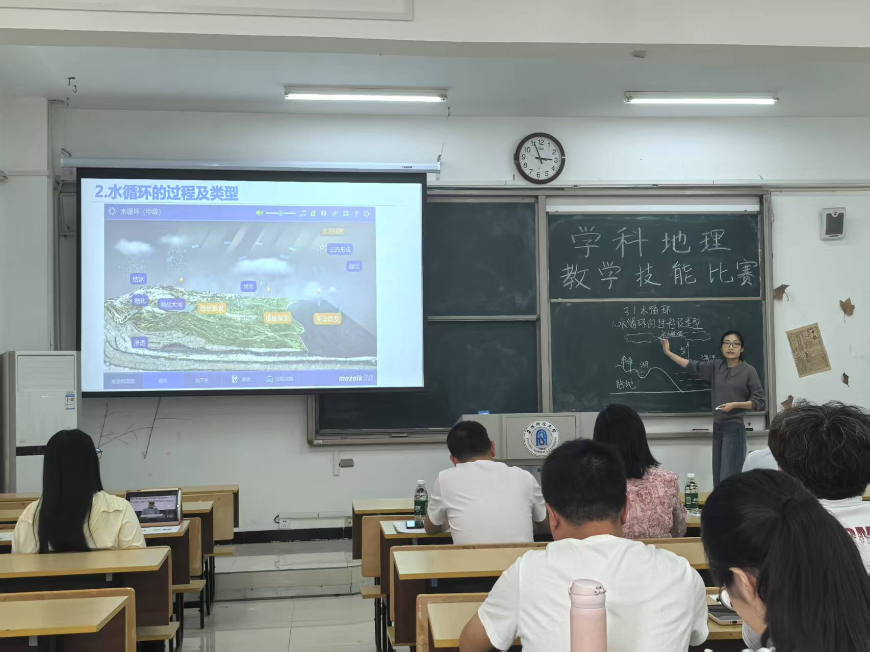 为深入贯彻落实新时代教师培养目标,持续提升师范类研究生教学能力和综合素养,推动教学实践与理论研究深度融合,学院于4月30日成功举办第一届学科教学(地理)硕士研究生教学技能大赛。本次大赛由阜阳四中张立平、师大附中朱勇、张小辉三位中学地理教师担任评委,全体2024级学科教学(地理)硕士研究生参与此次比赛。