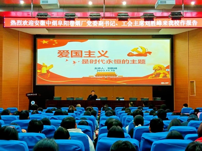 为根植马克思主义学院学子家国情怀,激发同学们的爱国热情,了解企业家精神。11月10日,安徽中烟阜阳卷烟厂党委副书记、工会主席刘胜峰在西湖校区躬行楼F楼报告厅为马院学生作题为《爱国主义是时代永恒的主题》的专题报告。报告会由学院院长闫成俭主持,部分思政课教师参加报告会。