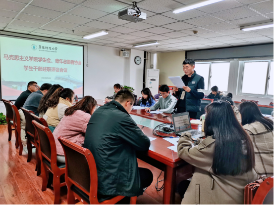 为推进学院团学干部组织深化改革成果落地见效,落实学生组织评议制度,促进团学组织健康发展,3月12日下午3时,马克思主义学院在正行楼912会议室举行2020-2021学年第一学期团学干部述职评议会,团总支学生会、青年志愿者协会全体学生干部及部分学生代表参加会议。会议由学院团总支负责人黄宝主持。