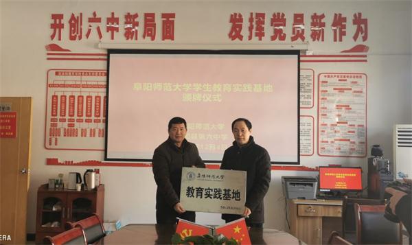 阜阳师范大学太和第六中学教育实践基地(NO:JYSJ041)签约仪式在太和六中行政楼二楼会议室举行,闫成俭院长一行,太和县政府督导室主任、教育局党组成员李刚,太和六中刘勋校长等学校领导及实习五位学生参加签约仪式活动。
