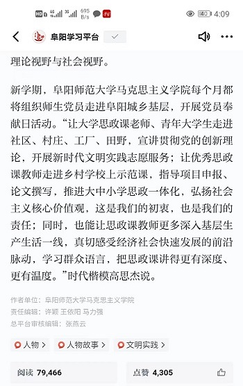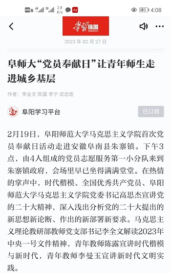 2月19日,阜阳师范大学马克思主义学院首次“党员奉献日”让青年师生走进城乡基层活动,目前在学习强国平台阅读量近八万,反映出马克思主义学院“党员奉献日”活动取得了丰硕成果,也是“党建+”党建工作取得的显著成效,展现了马克思主义学院青年教师的风采,提升了学院的影响力。