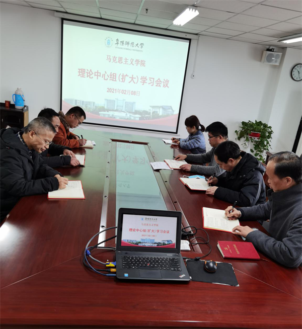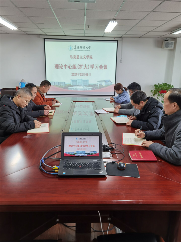 2021年2月8日上午,马克思主义学院在正行楼912召开理论学习中心组(扩大)会。学院党总支书记高思杰主持会议,党总支副书记、院长闫成俭,党总支委员、副院长朱宗友,4个党支部书记参加会议。