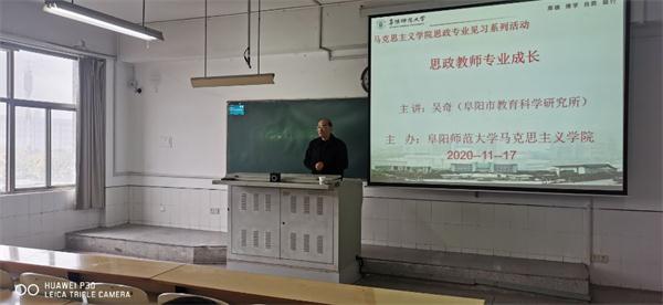 为了帮助学生深入了解思政专业,了解思政课教师必备的素养和技能,提高学院思政专业人才培养质量,在学校统一部署和马克思主义学院安排下,2020年11月17日上午,马克思主义学院在西湖校区景行楼307教室举行了以“思政教师专业成长”为主题的专题讲座。讲座特邀阜阳市教育科学研究所所长吴奇老师主讲,马克思主义学院院长闫成俭,思政教研室主任宋俊义老师、于晓娟老师出席了本次讲座,2018级、2019级全体学生聆听了此次讲座。