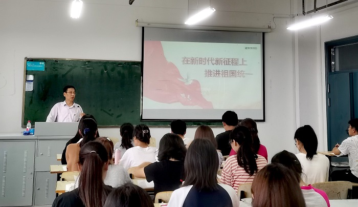 季爱新以“在新时代新征程上推进祖国统一”为主题,围绕“接续奋斗的光辉历程、不可阻挡的统一大势、与时俱进的行动纲领”三个方面展开讲授。课堂上,季爱新首先以“关于台湾你能想到哪些词语”跟同学们展开互动,引出“台湾问题产生的由来”的话题,引发学生的兴趣与思考。他以佩洛西“窜台”事件为切入点,以丰富的历史史实系统讲述台湾问题的产生和演变;详细解读了事关两岸统一的“一国两制”科学构想与“九二共识”;辩证而深入地分析了台湾是中国的一部分的历史事实和法理事实、台湾问题是中国的内政问题以及中国共产党为解决台湾问题、实现祖国完全统一所进行的不懈奋斗。