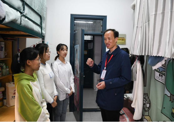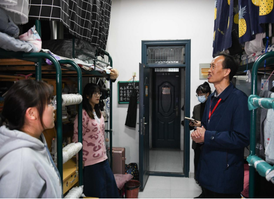 立冬时节,阜阳气温骤降,寒气逼人。晚上7时整,高思杰和辅导员一起先后走进二区宿舍10栋406-412室、508-510室,7栋403-404室,查看供电、供水设施,与学生仔细交流,聆听学生心声,了解食堂就餐、出行交通、寝室和谐等问题,为学生排忧解难。