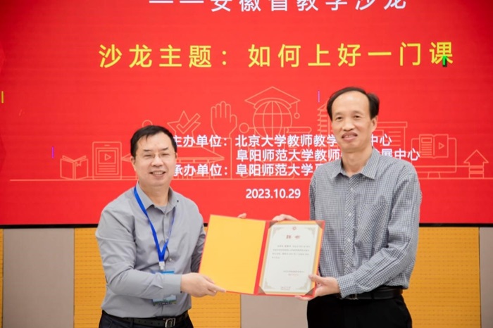为深入学习贯彻习近平总书记关于教育的重要论述,加强高校教师队伍建设,助力中西部高校新入职教师教学能力提升,10月29日,由北京大学教师教学发展中心与阜阳师范大学教师教学发展中心主办,阜阳师范大学马克思主义学院承办的“2023-2024年度中西部高等学校新入职教师国培示范项目——安徽省教学沙龙”活动在阜阳师范大学西湖校区化工楼一楼多功能智慧教室举行。