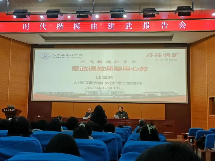 举引航之灯,照成才之路。把道理讲深、讲透、讲活,思政课教师要用心教,学生要用心悟。12月11日上午,马克思主义学院邀请“全国优秀教师”、“万人计划教学名师”、“时代楷模”、“最美奋斗者”、大连海事大学博士生导师曲建武教授在F楼报告厅作了题为《思政课教师要用心教》的专题报告,报告由马克思主义学院原党委书记高思杰主持。学院党委书记、副书记、专兼职辅导员、思政课老师,思想政治教育专业学生等近200人聆听了报告,报告会现场座无虚席。