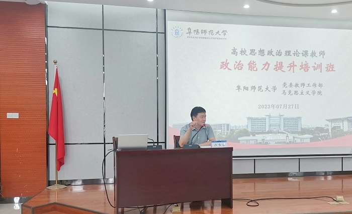 7月26日上午,由阜阳师范大学马克思主义学院教授李全文作《精彩入戏,做合格的思政课教师》专题报告,阜阳师范大学马克思主义学院党委副书记、院长闫成俭教授作《守住思政课教师的三个底线》专题报告。马克思主义学院党委委员、副院长朱宗友主持。