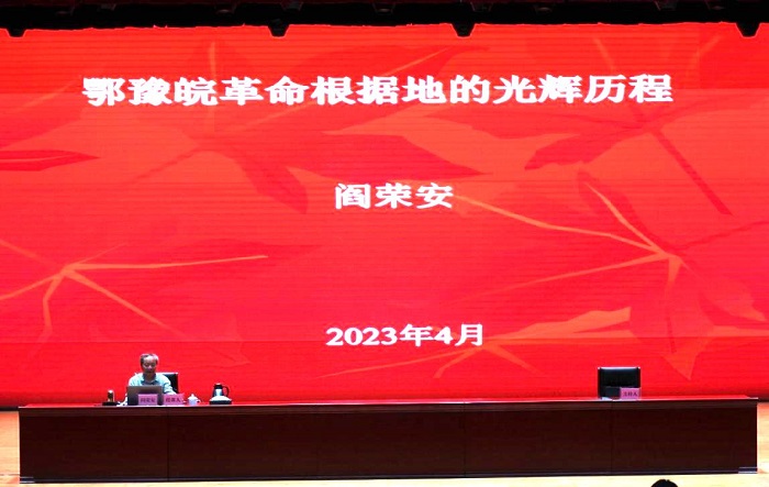 在金寨县干部学院,学院邀请金寨红军历史研究会、新四军历史研究会会长、著名党史专家阎荣安为同学们做“鄂豫皖革命根据地的光辉历程”学术报告。闫荣安从鄂豫皖革命根据地的概况、光辉历程、历史地位和深远意义为同学们介绍了鄂豫皖革命根据地的不朽历史以及一些革命先辈走过的光辉历程,并用具体实例阐释了“牺牲奉献、一心为民、坚贞忠诚、永跟党走”的大别山革命精神。