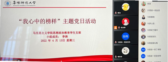 4月13日下午,马克思主义学院思想政治教育专业学生党支部举办“我心中的榜样”主题党日线上互动党课活动,充分发挥党组织的战斗堡垒作用和共产党员的先锋模范作用,加强学生党员教育、提高党性修养,激励学生认真落实学校疫情防控部署,护一校平安。支部全体学生党员和入党积极分子参加线上互动党课学习。