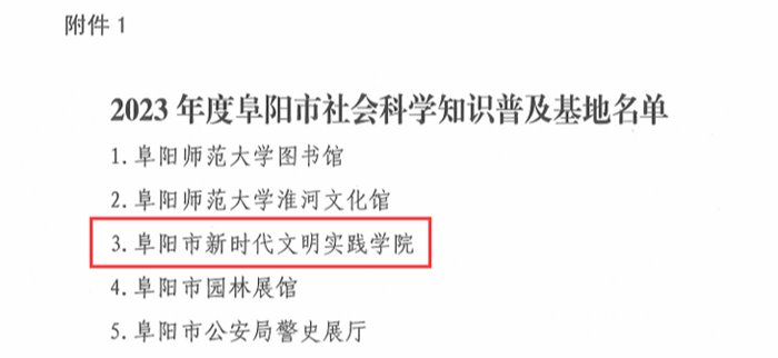 从阜阳市社会社会科学界联合会获悉,由阜阳市委宣传部、阜阳市文明办、阜阳市社科联、阜阳市委讲师团、阜阳师范大学马克思主义学院联合成立的阜阳市新时代文明实践学院于2023年10月23日被命名为2023年度阜阳市社会科学知识普及基地,同时入选的还有阜阳师范大学图书馆和淮河文化馆等。