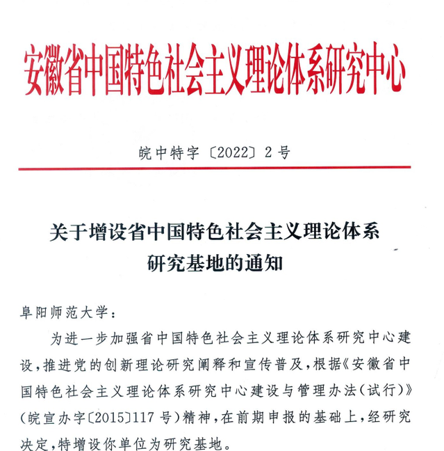 近日,安徽省中国特色社会主义理论体系研究中心下发《关于增设省中国特色社会主义理论体系研究基地的通知》(皖中特字〔2022〕2号),我校成功获批安徽省中国特色社会主义理论体系研究基地。