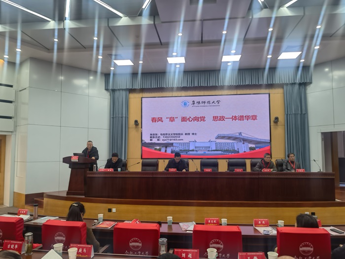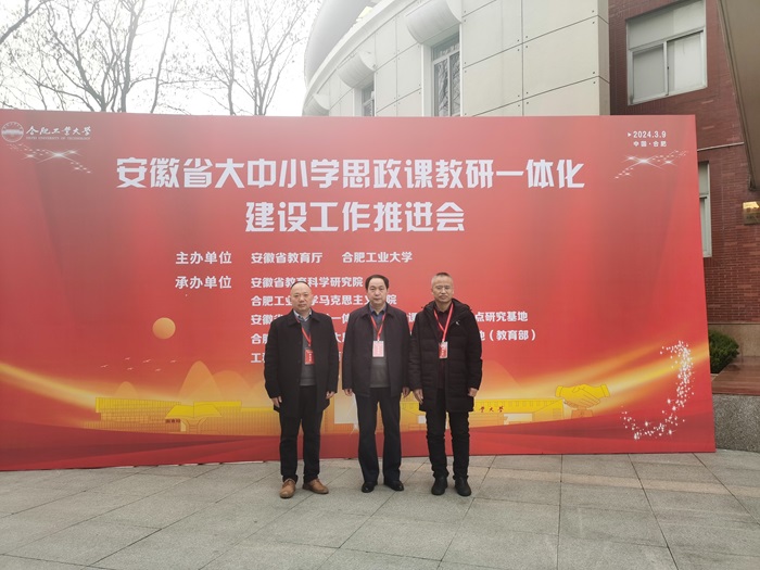 3月9日,由安徽省教育厅、合肥工业大学联合主办的安徽省大中小学思政课教研一体化建设工作推进会在合肥工业大学举行。来自全省高校的马克思主义学院,各地市教科所和大中小思政课学科专家一百多人齐聚一堂研讨交流大中小思政课一体化共同体建设。省教育厅二级巡视员林兴德、思政处处长王后林、省教科院院长王勇、省大中小思政课一体化建设专家指导组组长刘新跃等出席会议。我校研究生处处长闫成俭、马克思主义学院院长朱宗友受邀参会。朱宗友代表学校作了“春风‘阜’面心向党思政一体谱华章”的主题发言。