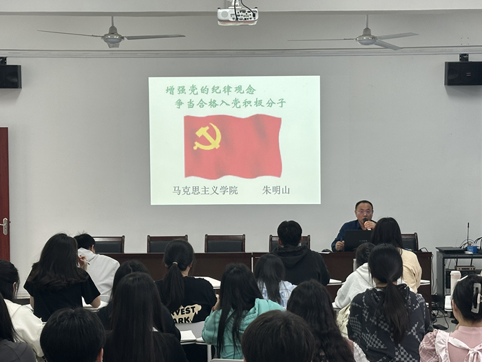 开班仪式后,朱明山以“增强党的纪律教育 争当合格入党积极分子”为主题,为本期入党积极分子讲授第一次党课。