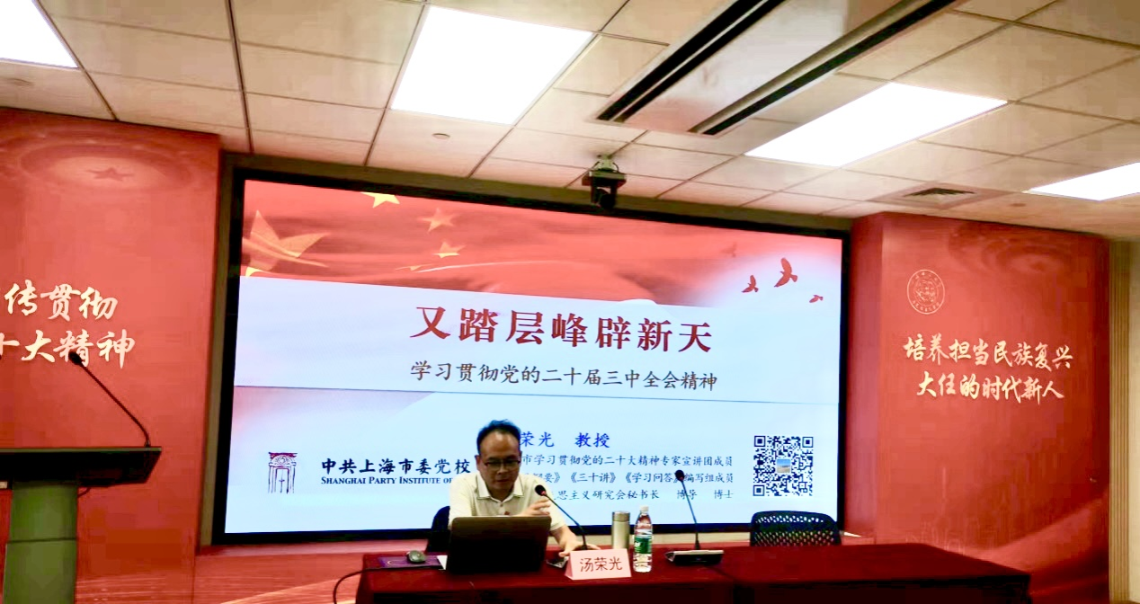 为全面深入系统学习党的二十届三中全会精神,贯彻落实习近平总书记关于思政课建设的重要论述和系列讲话精神,推进党的创新理论入脑入心入魂,持续增进思政课立德树人、铸魂育人实绩实效,学院特邀上海市马克思主义研究会秘书长、上海市委党校马克思主义学院教授、上海师范大学马克思主义学院兼职博士生导师汤荣光作了题为“又踏层峰辟新天:学习贯彻党的二十届三中全会精神”的专题辅导报告。学院思政课教师共60余人参加此次报告会。