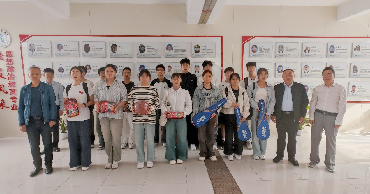 会后,学院领导发放体育用品并与各班代表合影留念。