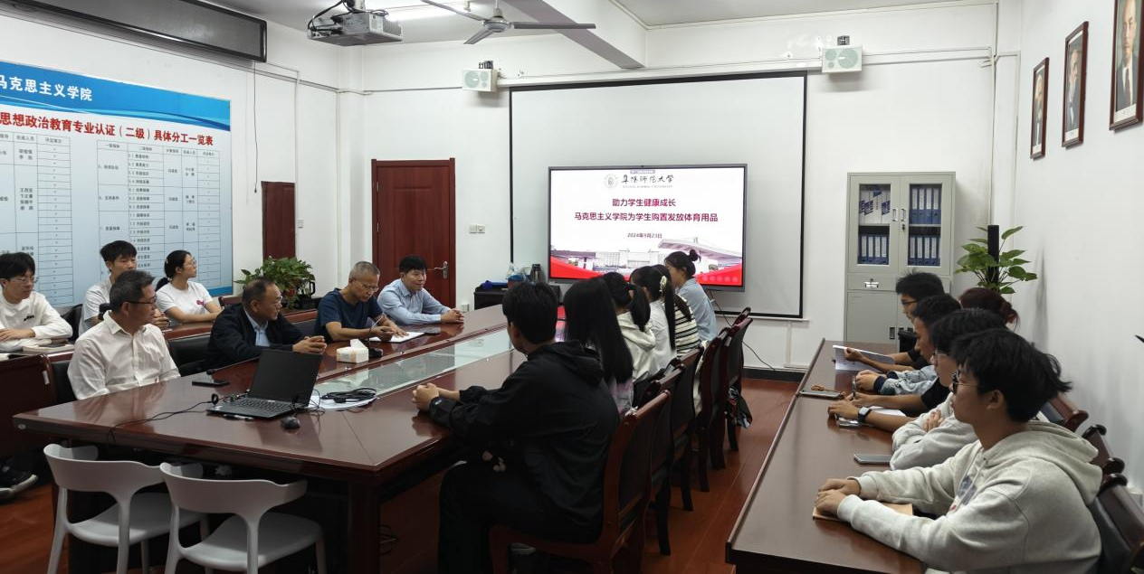 为深入贯彻习近平总书记关于体育的重要论述,坚持健康第一的教育理念,深刻认识和充分发挥青少年体育工作在加快建设教育强国、体育强国、健康中国中的重要作用,促进学生身心健康成长,丰富校园文化生活。马克思主义学院积极响应学校相关部门工作部署,9月23日在三里桥校区马院楼211会议室召开加强体育锻炼工作会议,并为学生发放体育用品。马克思主义学院党委书记朱明山、党委副书记、院长朱宗友,副院长夏小华,党委副书记王刚及各年级辅导员、部分学生代表参加会议。会议由朱明山主持。