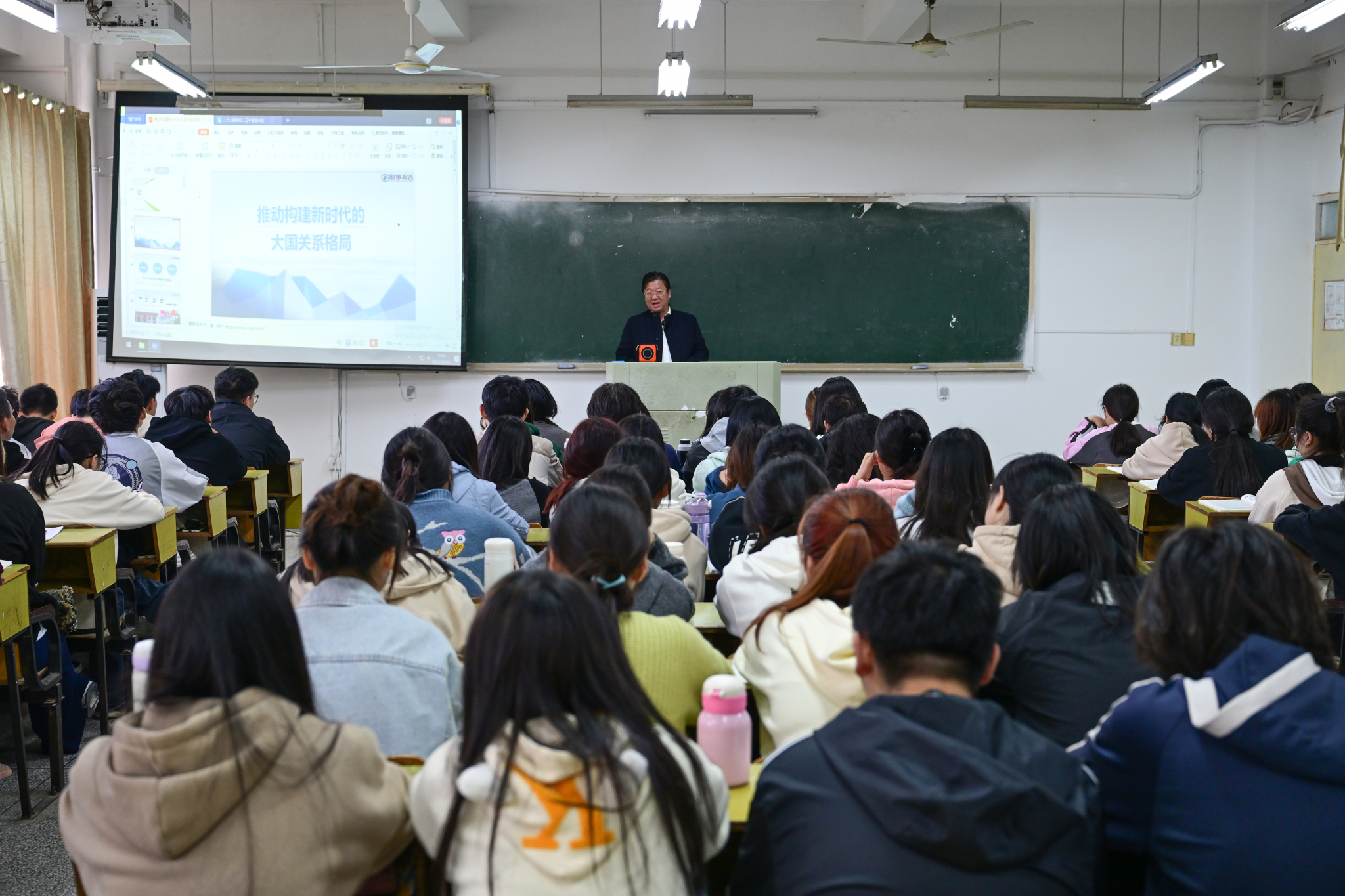 为坚持不懈用习近平新时代中国特色社会主义思想铸魂育人,大力推动党的二十大及二十届三中全会精神融入思政课,深入贯彻落实习近平总书记关于思政课建设的重要指示,我校党委书记程曦带头进教室讲思政课。10月25日和28日,程曦分别为我校2023级思想政治教育和生物制药两个教学班级的同学主讲了题为《推动构建新时代大国关系格局》的《形势与政策》课,马克思主义学院党委副书记、院长朱宗友,副院长赵永明,校领导联系的思政课教师韩旭等同志陪同参与讲思政课活动。