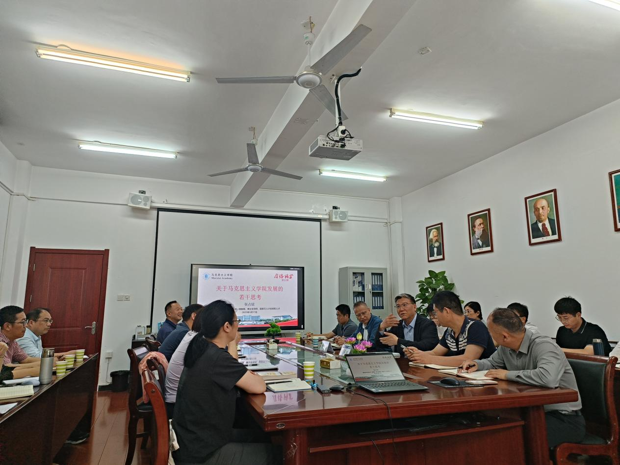 为进一步提升学院的学科建设水平、教师的科研水平与学术素养,5月17日下午,马克思主义学院邀请国家哲学社会科学一级教授、博士生导师、国家万人计划领军人才张占斌教授,作题为《关于马克思主义学院发展的若干思考》的学术报告。报告在学院211会议室举行,学院党委副书记、院长朱宗友主持。
