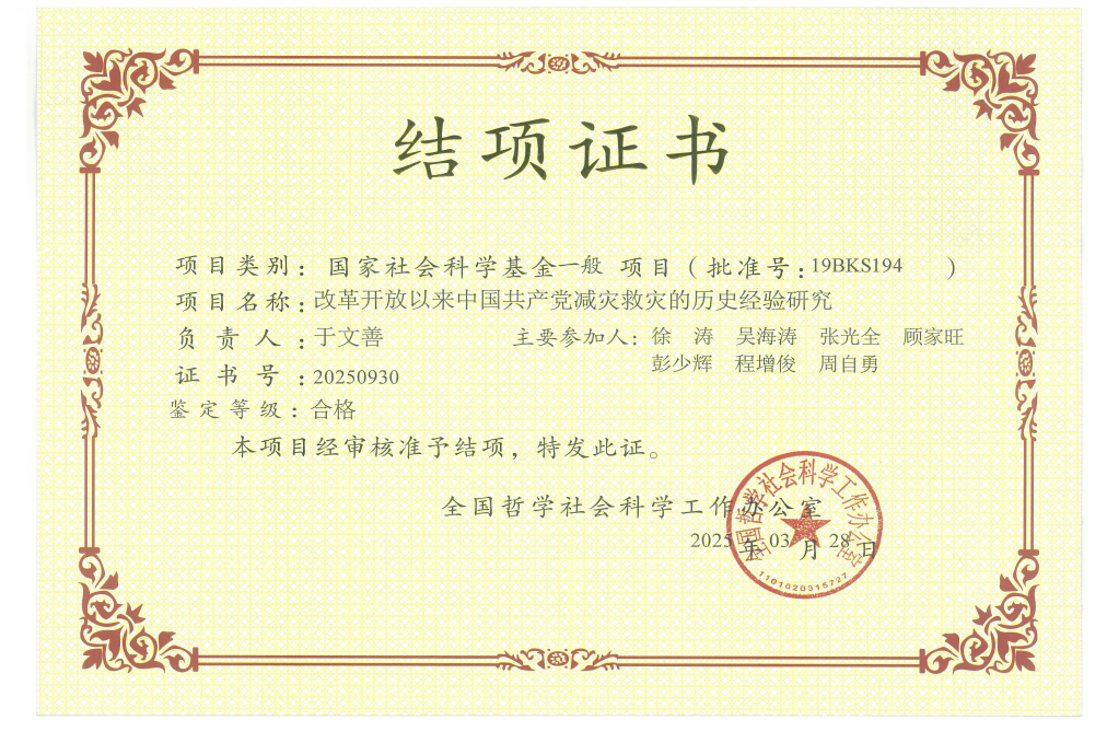 近日,由纲要课教研室于文善教授主持的国家社会科学基金一般项目——“改革开放以来中国共产党减灾救灾的历史经验研究”(19BKS194)通过专家鉴定与全国社科规划办审核,以合格等次顺利结项。项目研究成果为专著,字数26万余字。